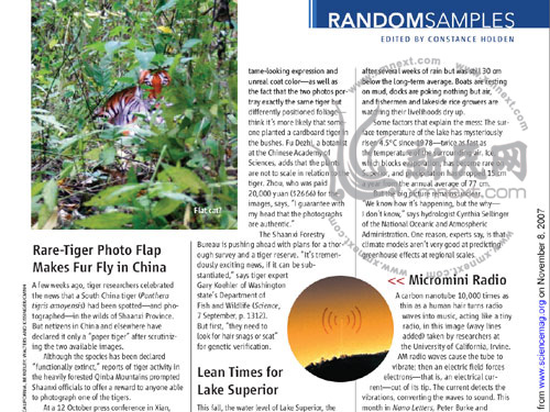 華南虎照事件又有新進(jìn)展,據(jù)新民網(wǎng)了解,世界權(quán)威科學(xué)雜志《科學(xué)》11月9日正式刊出極具爭(zhēng)議的中國(guó)陜西村民周正龍聲稱拍到的華南虎照片。在《科學(xué)》雜志“Randomsamples”(隨機(jī)樣本)欄目中,一篇題為“Rare-tiger photo flap makes fur fly in china”(珍惜老虎照在中國(guó)鬧得沸沸揚(yáng)揚(yáng))的新聞稿報(bào)道了中國(guó)華南虎照風(fēng)波。