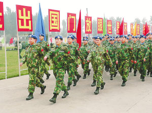 “走出國(guó)門(mén),傳承文明友誼;維護(hù)和平,共建和諧世界!”一隊(duì)頭戴藍(lán)色貝雷帽、身穿迷彩服、胳膊上佩戴著“地球和橄欖枝”臂章的士兵踏著整齊的步點(diǎn),喊著鏗鏘有力的號(hào)子,出現(xiàn)在筆者面前。