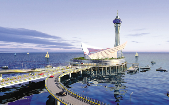 杭州灣跨海大橋的“點睛之筆”——海中平臺房及觀光塔,今天起由精工鋼構(gòu)集團開始建設(shè)。整個工程包括平臺房、觀光塔以及連接棧橋三部分。其中平臺房建筑面積為36617平方米,共6層;觀光塔總建筑面積為5100平方米,共16層,建筑高度為145.6米。