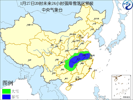 中新網(wǎng)1月27日電 中國中央氣象臺(tái)今天下午六點(diǎn)鐘發(fā)布最高等級(jí)的暴雪紅色警報(bào),顯示湘鄂豫皖蘇等地的部分地區(qū)有暴雪。