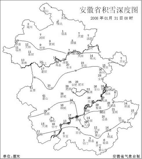 中新網(wǎng)1月31日電 據(jù)問天網(wǎng)消息,安徽省氣象臺消息,截至今天早晨08時(shí),全省各地仍有積雪,其中沿淮到江南北部積雪深度普遍在10厘米以上,江淮中部和沿江東部超過25厘米,最深金寨、霍山為41厘米。