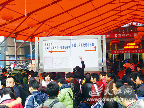“下列車次在此進站候車,其余車次請到廣場黃色臨時候車棚候車!痹谡厩皬V場,記者看到原先旅客等候進站的區(qū)域已搭起多個不同顏色風雨棚,在候車大廳門口的紅色風雨棚前,立著一塊提示牌,牌子上分左右列出了各趟列車的候車要求,因此旅客們可以及時得知自己所乘列車的運行情況,憑票提前2小時由此進站候車,而在一邊的黃色風雨棚內(nèi),則是等候稍晚到達列車的旅客。由于分類清晰,整個火車站的候車秩序良好。