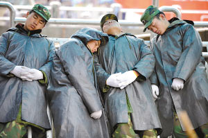 “真是太不好意思了!”下午4點25分,在該部二連會議室,記者見到了4名戰(zhàn)士的“廬山真面目”。面對記者的追問,他們對“站著睡覺”一事表現(xiàn)得十分尷尬!白鳛榘嚅L骨干,我們更愿意將自己威武剛毅的形象展現(xiàn)給人民群眾,可是由于已經(jīng)連續(xù)奮戰(zhàn)了39個小時,確實累得沒有辦法。從到火車站執(zhí)行任務(wù)開始,背包都沒有打開過!秉S金華說。