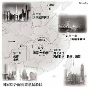 2007年6月,重慶和成都聯(lián)合獲準(zhǔn)成立“成渝全國統(tǒng)籌城鄉(xiāng)綜合配套改革試驗區(qū)”;12月,位于中部腹地的武漢城市圈和長沙、株洲、湘潭城市群成為“全國資源節(jié)約型和環(huán)境友好型社會建設(shè)綜合配套改革試驗區(qū)”。