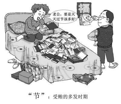 “節(jié)”即節(jié)日。調(diào)查表明,節(jié)日最容易發(fā)生賄賂犯罪,有約一半以上的賄賂犯罪是在節(jié)假日發(fā)生的。在“禮尚往來”幌子的掩蓋下,各種錢權(quán)交易最容易盛行。群眾中流傳一句順口溜:“干部廉不廉,重點(diǎn)看過年”!肮(jié)”已成為一些官員受賄的多發(fā)時(shí)期。