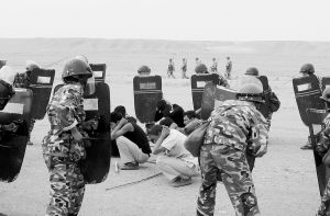 前方指揮部王部長立即下達(dá)捕殲命令。頓時(shí),一排排突擊炮彈朝著“恐怖分子”駕車沖來的公路傾瀉。直升機(jī)飛臨上空。第五作戰(zhàn)小組10多名戰(zhàn)斗隊(duì)員從直升機(jī)上躍下,直撲“恐怖分子”。