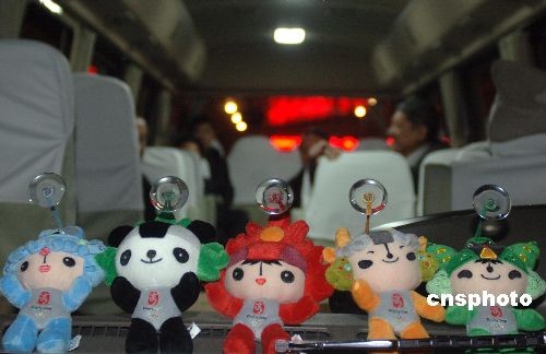 迎接的車輛上放置的奧運福娃。中新社發(fā) 廖攀 攝