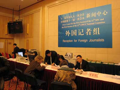 在記者的接待和安排方面,今年全國兩會(huì)在借鑒以前中共十七大期間一些好的做法的基礎(chǔ)上,還為中外記者推出了免費(fèi)上網(wǎng),免費(fèi)提供有關(guān)中國的圖書資料以及咖啡和餐點(diǎn)等一系列的貼心“服務(wù)”。祝壽臣介紹說:“這屆的兩會(huì)新聞中心借鑒了十七大一些好的做法,當(dāng)然同時(shí)也繼承了過去兩會(huì)新聞中心的一些好做法,增加了很多新的服務(wù)項(xiàng)目。比如第一次免費(fèi)提供中央人民廣播電臺(tái),中央電視臺(tái)的信號(hào),第一次免費(fèi)向記者提供新華社的適時(shí)新聞圖片,第一次免費(fèi)向記者提供寬帶上網(wǎng)服務(wù),同時(shí)我們還免費(fèi)向記者提供咖啡和茶點(diǎn)服務(wù)。此外,這次兩會(huì)還提供了很多圖書資料,有中國政治經(jīng)濟(jì)各方面的情況介紹,還有一些專題資料,資料種類大概有100多種,資料擺上來以后很快就被中外記者搶空了!
