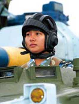2007年1 月,裝甲戰(zhàn)車駕駛考核在一個復(fù)雜山地如期舉行。文敏是參加考核的惟一女隊(duì)員。