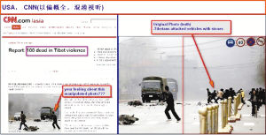 其一是“以偏概全,混淆視聽(tīng)”。3月17日,CNN和法新社在各自網(wǎng)站上使用了同一張圖片,圖中兩輛綠色卡車一前一后正向兩名平民駛來(lái)——事實(shí)上,如果完整展示圖片的話,可以看到當(dāng)時(shí)軍車旁有約10名暴徒在向軍車投擲石塊,雖然CNN網(wǎng)站的圖片說(shuō)明寫的是“藏人向軍車投擲石塊”,但圖中卻看不見(jiàn)這一已被裁去的場(chǎng)景。