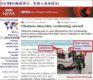 《驚!西方媒體竟然這樣做西藏事件的新聞!》就是較早的一篇對西方媒體報道指錯的文章,該文章還配有11張圖片,詳細(xì)地指明了這些媒體的錯誤所在。