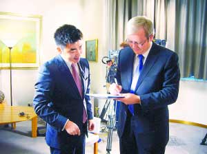 針對當(dāng)前的國際經(jīng)濟(jì)形勢,陸克文坦言,兩國之間應(yīng)該建立良好的經(jīng)濟(jì)伙伴關(guān)系,共同面對世界經(jīng)濟(jì)格局的變化!拔艺J(rèn)為如果我們的國家能夠協(xié)調(diào)我們的合作,不僅是管理我們雙方的利益,而且對全地區(qū),以及全世界所面對的問題,我想我能夠給全世界人民帶來很大的一種好處!