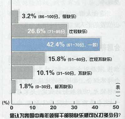 心態(tài)指人們對待事物的心理態(tài)度,是人的心理對各種信息刺激做出反應的趨向。心態(tài)構(gòu)成情緒,心態(tài)反映認知,心態(tài)決定行為。良好的心態(tài)必然產(chǎn)生快樂感、幸福感和滿意感,良好的心態(tài)也有助于提高人的工作效率和生活質(zhì)量,更有益于人的健康。此次調(diào)查顯示,大多數(shù)中青年干部給自己目前的工作、生活狀況打了較高分。就整體而言,在回答“若以百分制打分的話,您認為我國中青年領(lǐng)導干部的快樂感可打多少分?”時,有72.2%的人選擇了61分以上。(見表一)在個人層面,有50.4%的受訪者“對自己目前工作狀況的滿意度”給出了71分以上的高分,處于“很快樂”和“比較快樂”的心理狀態(tài),加上選擇61分~70分即“一般快樂”的28.8%,總計占了79.2%。(見表二)有60.7%的受訪者“對自己目前生活狀況的滿意度”給出了71以上的高分,處于“很滿意”和“比較滿意”的心理狀態(tài),加上選擇61分~70分即“一般滿意”的25.6%,總計達到了80.3%。(見表三)上述結(jié)果表明,大多數(shù)中青年干部心態(tài)良好,但極少數(shù)人表達出來的不快樂、不滿意傾向也不容忽視,這一傾向往往是構(gòu)成心理和行為問題的潛在因素。