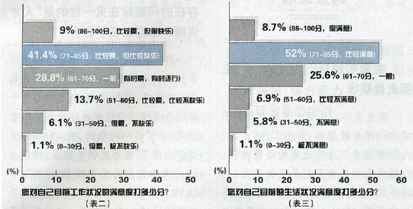 調(diào)查顯示,盡管大多數(shù)中青年干部的心理是健康的,但由工作、生活、人際等諸多壓力而造成的心理沖突、心理失衡和精神壓抑是無處不在、無時(shí)不有的。受訪者在回答“如果您覺得活得很累,您認(rèn)為您的壓力主要來自哪些方面?”這一問題時(shí),選擇最多的前三項(xiàng)分別是“工作責(zé)任心太強(qiáng),追求完美之累”,“工作負(fù)荷重,疲于奔命之累”,“迎合領(lǐng)導(dǎo)出政績,失去自我之累”,選擇比例分別達(dá)到了51.3%,34.7%和29.2%,而選擇“交際太繁,苦于應(yīng)酬之累”,“前程靠人恩賜,職場非正常競爭之累”的各占20.3%,并列排在第四位,最后依次是“家庭負(fù)擔(dān)重,子女入學(xué)就業(yè)之累”,占12.9%,“與同事、朋友比心理不平衡之累”,占5.9%,以及“多種壓力”等,占2.6%。