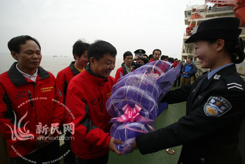 邊檢民警為雪龍?zhí)栴I(lǐng)隊(duì)獻(xiàn)花 新民網(wǎng) 崔健 彭博 攝