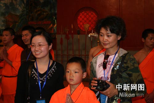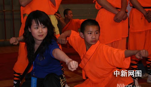 中新網(wǎng)4月18日電 “網(wǎng)上看河南”采風(fēng)團(tuán)女記者17日訪問(wèn)河南登封少林鵝坡武術(shù)專修院,與習(xí)武者“爭(zhēng)鋒”,并合影留念。