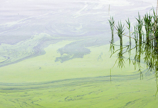 雖然經(jīng)過多日雨水的稀釋,但前日陽光下,湖州南太湖邊的水面上,一層綠膜仍泛著油光。“這些就是藍藻!币晃粷O民告訴記者。