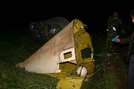 約莫15分鐘,在一個觀察哨值勤的觀察員王世華突然報告,稱殘骸就落在他附近約200米的山溝里,殘骸目標已發(fā)現(xiàn)。山溝里沒有住戶,未造成人員傷亡和房屋、林木的損毀。