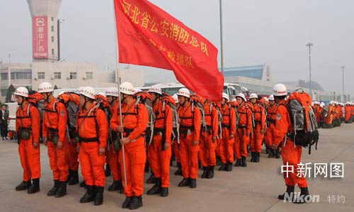 中新網(wǎng)石家莊5月14日電 (顧文娜 郭仁昭)十四日上午,河北省一支由三百人組成的消防抗震救災(zāi)應(yīng)急救援隊(duì)在正定機(jī)場(chǎng)集結(jié)登機(jī),緊急馳援四川災(zāi)區(qū)一線。