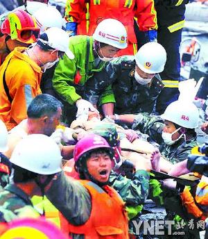 6點(diǎn)10分,手已經(jīng)伸了出來,肩膀還卡著。消防隊(duì)員找了一塊門板,做好了最后的準(zhǔn)備。由于是五層樓坍塌,層層疊加在上面,都是水泥板,后面有木板,只能掏一個洞慢慢掏進(jìn)去。但是到下午,卞剛芬生命體征開始變得衰弱,消防人員用一根管子,不斷給她喂水和牛奶,并不時和她聊天給她鼓勵。下午6點(diǎn)15分,在一片歡呼聲中,卞剛芬被成功救出,F(xiàn)場的醫(yī)療人員迅速對其進(jìn)行身體特征的檢查并對其輸液,F(xiàn)場響起一片掌聲。(馬輝 周春林)