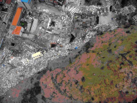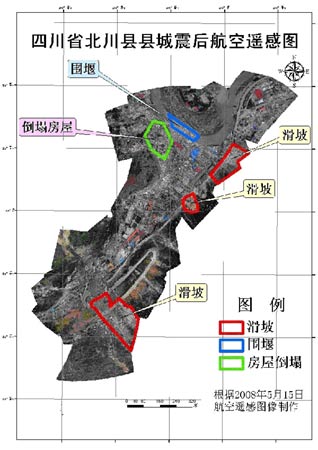 四川汶川8.0級強烈地震發(fā)生后,民政部國家減災中心組建技術(shù)工作組趕赴四川地震災區(qū)開展災情評估工作。5月15日上午,工作組利用小型無人駕駛飛機在重災縣北川進行了航拍,共獲取北川縣城南部地區(qū)高清晰航拍照片與視頻影像。并與首都師范大學合作對數(shù)據(jù)進行判讀。