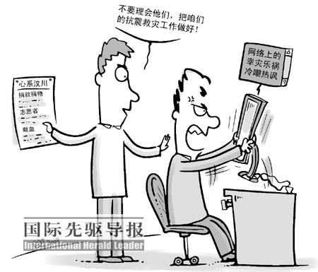 但與此同時,另一種聲音也最先從東邊的鄰國那里傳來。在韓國政府和多數(shù)民眾紛紛以不同方式支援中國的同時,韓國網(wǎng)絡(luò)上卻充滿了幸災(zāi)樂禍。一些韓國網(wǎng)民揚(yáng)言“取消奧運(yùn)會”,還有人甚至稱“地震是對中國的懲罰”。這種丑陋的言論很快傳到國內(nèi),中國網(wǎng)友對此自然氣憤難平。其實(shí),對于這些刺耳的聲音,我們本不必過于在意。