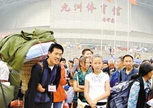汶川大地震發(fā)生后,綿陽九洲體育館成了受災(zāi)群眾的臨時安置點,數(shù)萬村民曾被轉(zhuǎn)移到這里。不過,昨天,記者在現(xiàn)場看到,幾十輛大巴正在將部分村民轉(zhuǎn)移出去,“我們是回家!北持罂、排著隊的村民說。