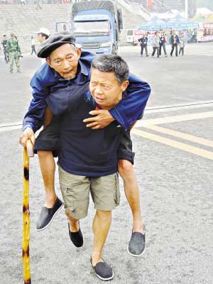 50歲的金光銀背著82歲的老父親金云才也來排隊。老人身體不好,腿腳不便,只有讓兒子背著走路。金光銀說:“政府都給我們安排好了,我們要轉(zhuǎn)移了!