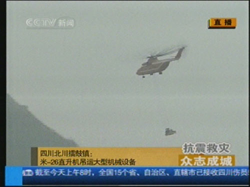 中新網(wǎng)綿陽5月26日電(霍潺)今天上午十一點零五分左右,一架紅色米-26直升機(jī)吊裝了一臺重約十三點二噸的重型挖掘機(jī)已起飛,前往唐家山堰塞湖壩體,大約二十多分鐘可以往返。