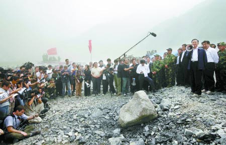 15時(shí)55分,新華網(wǎng)再次發(fā)出快訊:胡錦濤總書(shū)記作出重要指示,要求盡快搶救傷員,保證災(zāi)區(qū)人民生命安全。溫家寶總理趕赴災(zāi)區(qū)。