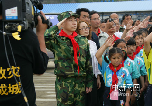 5月30日,航天英雄楊利偉來到總裝備部綿陽八一帳篷學(xué)校,與孩子們一起歡度六一兒童節(jié)。圖為向國旗敬禮。秦憲安 攝