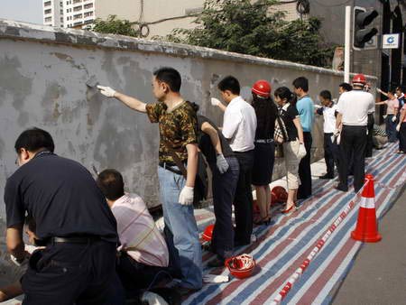 6月3日清晨的成都市繁華中心鹽市口國(guó)際商場(chǎng)圍墻邊,成都錦江區(qū)四大班子領(lǐng)導(dǎo)、機(jī)關(guān)干部、各街道辦黨政主要負(fù)責(zé)人在區(qū)委書記周思源和區(qū)長(zhǎng)張濟(jì)環(huán)帶領(lǐng)下,正認(rèn)真地粉刷著圍墻。四川新聞網(wǎng)記者獲悉,作為清潔城市大行動(dòng)的一個(gè)部分,錦江區(qū)將根據(jù)創(chuàng)建成都市最清潔城區(qū)的目標(biāo),從即日起在全區(qū)范圍內(nèi)展開粉刷圍墻行動(dòng)。