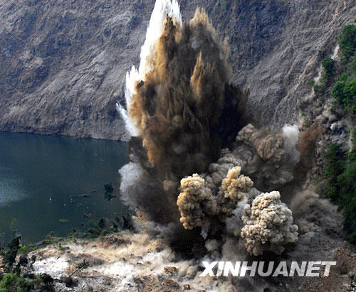 汶川地震發(fā)生后,青川縣青竹江石板溝一帶形成蓄水1200多萬立方米水的堰塞湖,威脅著下游數(shù)萬人安危,其中蓄水超過800萬立方米的石板溝堰塞湖被水利專家定為高危湖。隨著雨季來臨,高70多米的堤壩隨時都可能出現(xiàn)險情。為防止意外發(fā)生,武警水電三總隊對石板溝堰塞湖大壩實施了泄洪口爆破。