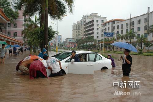 受高空槽和切變線共同影響,六月五日至六日,廣東茂名各地出現(xiàn)明顯強(qiáng)降水過程,全市日降雨量均值八十五毫米。由于降雨量大且強(qiáng),致使茂名市局部地區(qū)出現(xiàn)洪澇和山體滑坡災(zāi)害,并導(dǎo)致高州古丁鎮(zhèn)一名九歲男學(xué)生及一名十四歲女學(xué)生失蹤。據(jù)統(tǒng)計(jì),這次暴雨成災(zāi),茂名全市有六個縣區(qū)八十一個鎮(zhèn)約六十萬人受災(zāi),倒塌房屋近千間,直接經(jīng)濟(jì)總損失二億元人民幣。圖為茂名市區(qū)幾成澤國。 中新社發(fā) 梁盛 攝