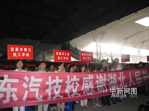 “我們都是你親人”、“熱列歡迎新同學(xué)”、“鄂川人民心連心”,7日的武昌火車(chē)站一號(hào)站臺(tái),前來(lái)迎接這批學(xué)生的湖北技工院校師生高舉溫情的標(biāo)語(yǔ)。每個(gè)學(xué)校還專門(mén)安排了迎接接收學(xué)生的校車(chē),并整齊地停在站臺(tái)上。當(dāng)四川技校生一踏上車(chē)站,即刻被站臺(tái)上熱情的人們所包圍。來(lái)自湖北各地的技工院校,將災(zāi)區(qū)學(xué)生分別有秩序地帶領(lǐng)到各自對(duì)口接收學(xué)校的校牌下集中,排成整齊的隊(duì)伍,并點(diǎn)名清點(diǎn)人數(shù)。