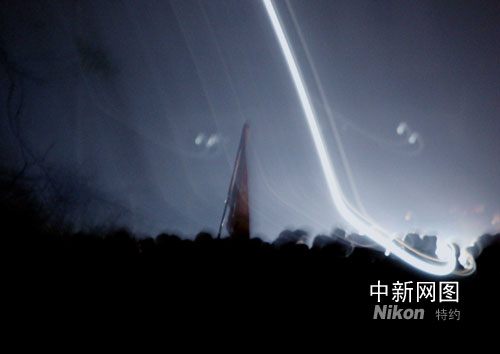 失事直升機(jī)部分遇難者遺體,由四川省軍區(qū)的阿壩軍分區(qū)和雅安軍分區(qū)預(yù)備役官兵日夜搶運(yùn)。于十三日子夜零點(diǎn)時(shí)分先后運(yùn)抵四川省映秀鎮(zhèn),圖為在映秀鎮(zhèn)外高山上出現(xiàn)運(yùn)送隊(duì)伍的微弱燈光(右下角)。作者:賈國榮