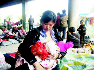地震發(fā)生后,被轉(zhuǎn)移來(lái)的嬰兒除了可以喝一點(diǎn)水和稀飯外,沒(méi)有其他東西可吃!按笕诉可以餓、還可以忍,而這些小嬰兒卻不能餓、不能忍!作為母親,我覺(jué)得這些孩子太可憐了。正好我還在哺乳期,就讓我來(lái)給他們喂奶吧!”在受災(zāi)群眾安置點(diǎn)協(xié)助工作的29歲民警蔣曉娟提出:我去給這些嬰兒哺乳!