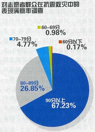 數(shù)據(jù)顯示,對志愿者在抗震救災中的表現(xiàn),67.23%的受調(diào)查者給出了90分以上的高分,給80分以上的則占到了94.08%,滿意率達到了98.85%。NGO組織和志愿者群體是此次抗震救災中的一支特別突出的力量,社會、新聞媒體無不為他們的出現(xiàn)和廣泛參與歡欣鼓舞,并喻其為公民社會發(fā)育的有力證明。從雪災到3·14藏獨事件,再到汶川大地震,中華民族可謂空前團結(jié),愛國熱情一浪高過一浪,在這一浪又一浪的愛國熱情面前,年輕人受到了洗禮,“80后”、“90后”得到了很好的鍛煉,表現(xiàn)讓世人側(cè)目。在志愿者隊伍里,活躍著為數(shù)不少的“80后”、“90后”,綠絲帶等志愿行動多數(shù)就是由他們發(fā)起。唐山志愿者、山東農(nóng)民工志愿者等等都給人們留下了深刻的印象。