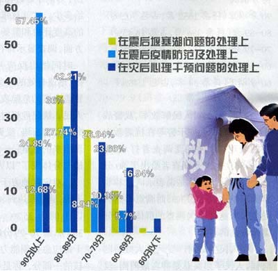 數(shù)據(jù)表明,對黨和政府在抗震救災中的表現(xiàn),滿意率達到94.81%。其中,對黨和國家領導人在抗震救災中的表現(xiàn),受調(diào)查者普遍表示了高度贊揚,90%的受訪者表示滿分是多少就給多少。這就意味著群眾對黨和政府的高度評價和贊揚。其中得分最高的方面,調(diào)查顯示排在前四位的是:在第一時間做出反應并趕赴抗震救災前線、迅速有效的應急反應和指揮部署、冒著余震的危險夜以繼日地安撫災區(qū)人民、情況危機時刻和看望災區(qū)人民時的動情言語。受調(diào)查者表示,政府表現(xiàn)出來的尊重每一個平民的生命的舉措充分體現(xiàn)了“以人為本”的理念。