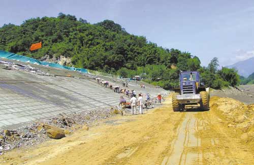 車在臨近水庫溢洪道的地方慢了下來,地震和降雨造成的山體塌方曾將該路段掩埋。塌方雖已基本清除,道路已能通行,但仍必須謹慎。山體滑坡的正下方,就是蓮花洞水庫的溢洪道,挖掘機正在將堵塞在溢洪孔道上的土石方轉移到大壩底部“壓腳”,以增強大壩安全性!耙绾榈莱袚雌谒畮煲绾楣δ,必須保持暢通。”寧順全告訴記者,目前上方的山體仍不穩(wěn)定,如遇長時大雨,有再次滑坡的可能,目前正準備對裂縫的巖石進行爆破。