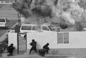 在指揮員下達(dá)攻擊令的余音聲中,突擊分隊兵分5路向目標(biāo)發(fā)起攻擊:從地下鉆出的特戰(zhàn)隊員,對大廳兩名歹徒實施了無聲射殺,迅速排除了出入口爆炸物,為救援行動打開了通道。空中垂降的特戰(zhàn)隊員從天窗潛入“歹徒”所在的樓層,乘坐攀登突擊車的兩組隊員左右破窗,與空中垂降的戰(zhàn)友同時攻入大廳,“歹徒”未及反抗,就被一一擊斃或制服。樓頂?shù)奶貞?zhàn)隊員在對防護(hù)窗實施精確爆破后,利用繩索從天而降,破窗而入,身體騰空中,舉槍擊發(fā),“歹徒”未及反應(yīng),就已中彈斃命,人質(zhì)被安全解救。
