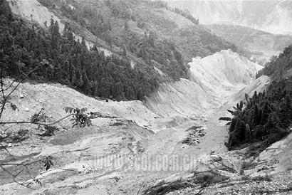 從百花大橋出口處山路行進(jìn)幾公里,到了牛圈溝。進(jìn)入溝內(nèi)不久,專(zhuān)家們被兩邊的情景驚呆了,這里更像是冰川遺跡:一大堆土石組成的固體流從兩公里外的一條支溝傾泄而來(lái),將所過(guò)之處掃得精光,兩道棱角分明的沖刷印跡,如刀削般留在溝兩邊的山體上;山體印跡以上樹(shù)林茂密,少有損傷;印跡之下,只有堆堆土石。固體流在傾泄過(guò)程中,曾受到山體阻攔,產(chǎn)生了三次折向,折向處有明顯的上揚(yáng)跡象,最高處達(dá)60米。