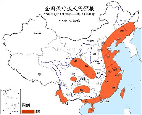 2008年8月11日08時—12日08時全國強對流天氣預報