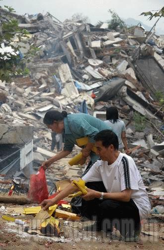 坐在老縣城畜牧局宿舍樓下,46歲的陳幫金無(wú)言地看著幫工扎紙人。這里,曾經(jīng)充滿(mǎn)了他和妻子的歡笑。但地震那天,44歲的妻子在新縣城天然氣公司附近遇難,按照當(dāng)?shù)仫L(fēng)俗,陳幫金要等紙人扎好后,和兒媳、弟妹一起,翻過(guò)廢墟到妻子遇難的地方祭拜。此景悲涼,陳幫金一家仍充滿(mǎn)了感激:“全靠政府政策好,從13日起就開(kāi)禁了,不然我們都不曉得什么時(shí)候才能回來(lái)拜一下。”