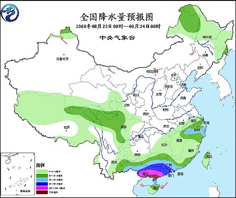 2008年8月23日08時(shí)—8月24日08時(shí)全國降水量預(yù)報(bào)圖