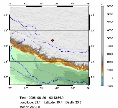 中新網(wǎng)8月26日電 據(jù)中國地震臺網(wǎng)中心消息,西藏自治區(qū)日喀則地區(qū)仲巴縣(北緯30.7度,東經(jīng)83.4度)26日凌晨3時13分發(fā)生里氏5.0級地震,震源深度33公里。