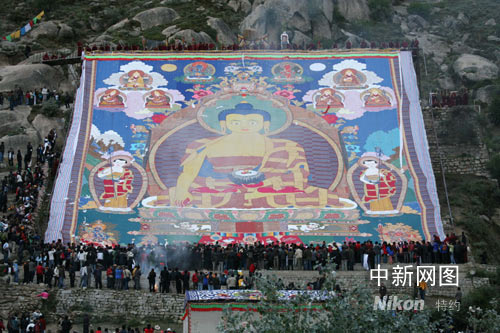 雪頓節(jié)最早是一種宗教活動,是老百姓以酸奶對寺院行長凈、夏安居之事后解禁僧人的敬奉。十七世紀下半葉,雪頓節(jié)逐漸演變和固定成以藏戲匯演和展佛為主、文娛與宗教相結(jié)合的重要節(jié)日,所以又被稱為“藏戲節(jié)”、“展佛節(jié)”。自去年起。該節(jié)升格為“中國拉薩雪頓節(jié)”,成為國家級旅游、文化、經(jīng)貿(mào)節(jié)慶。今晨有上萬游客及信眾在現(xiàn)場參觀了哲蚌寺展佛。