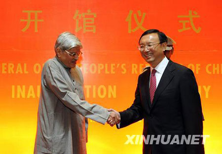 中新網(wǎng)9月8日電 據(jù)中國外交部網(wǎng)站消息,2008年9月7日,中國駐印度加爾各答總領(lǐng)事館舉行開館儀式。正在印度進(jìn)行訪問的中國外交部長楊潔篪同印度西孟加拉邦邦長甘地以及當(dāng)?shù)馗鹘缛耸亢腿A僑華人代表出席儀式。
