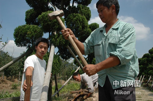 9月12日,園林工人在浙江臺(tái)州一苗圃加固花木,以應(yīng)對臺(tái)風(fēng)“森拉克”的到來。作 者:陳林聰