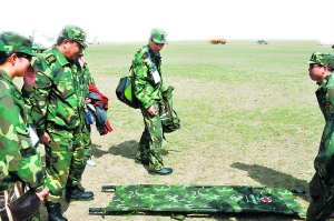 “神七”醫(yī)療救護隊在主著陸場附近集結(jié)進行有針對性的救護演練。